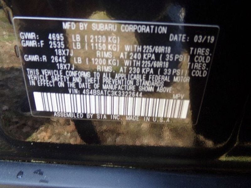 ASK ABOUT OUR NO PAYMENTS FOR 90 DAYS, Bluetooth®, REAR BACKUP CAMERA, SEE OUR CREDIT REBUILDING TEAM, AS LITTLE AS ZERO DOWN PAYMENTS AVAILABLE, 12 Speakers, 18 Alloy Wheels, 4-Wheel Disc Brakes, 4.111 Axle Ratio, ABS brakes, Air Conditioning, All-Weather Floor Liners, Alloy wheels, AM/FM radio: SiriusXM, Auto High-beam Headlights, Auto-dimming Rear-View mirror, Automatic temperature control, Brake assist, Bumpers: body-color, Cargo Net, CD player, Compass, Driver door bin, Driver vanity mirror, Dual front impact airbags, Dual front side impact airbags, Electronic Stability Control, Emergency communication system, Exterior Parking Camera Rear, Four wheel independent suspension, Front anti-roll bar, Front Bucket Seats, Front Center Armrest w/Storage, Front dual zone A/C, Front fog lights, Front reading lights, Fully automatic headlights, Garage door transmitter, harman/kardon Surround Sound Speaker System, harman/kardon® Speakers, Heated door mirrors, Heated Front Bucket Seats, Heated front seats, Heated rear seats, Heated steering wheel, Illuminated entry, Leather Shift Knob, Low tire pressure warning, Map & Dome Lights LED Upgrade, Memory seat, Navigation System, Occupant sensing airbag, Outside temperature display, Overhead airbag, Overhead console, Panic alarm, Passenger door bin, Passenger vanity mirror, Perforated Leather-Trimmed Upholstery, Popular Package #3A, Power door mirrors, Power driver seat, Power Liftgate, Power moonroof, Power passenger seat, Power steering, Power windows, Radio: Subaru STARLINK 8.0 Multimedia Nav System, Rear anti-roll bar, Rear Seat Back Protector, Rear seat center armrest, Rear window defroster, Rear window wiper, Remote keyless entry, Roof rack: rails only, Security system, Smartphone Integration, Speed control, Speed-sensing steering, Splash Guards, Split folding rear seat, Spoiler, Standard Model, STARLINK/Apple CarPlay/Android Auto, Steering wheel mounted audio controls, Steering Wheel Paddle Shift Control Switches, Tachometer, Telescoping steering wheel, Thule Crossbar Set - Touring, Tilt steering wheel, Traction control, Trip computer, Turn signal indicator mirrors, Variably intermittent wipers, Vehicle Information Display. Clean CARFAX. Crystal Black Silica 2019 Subaru Outback 2.5i Touring AWD CVT Lineartronic 2.5L 4-Cylinder DOHC 16V